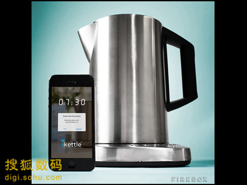 图中的iKettle并不只是一款设计精美的不锈钢电水壶,它还具备连接Wi-Fi的能力,并可以通过配套应用被智能手机所控制:想要烧水,只要按一下手机屏幕便可(当然你需要先把水倒进去)。