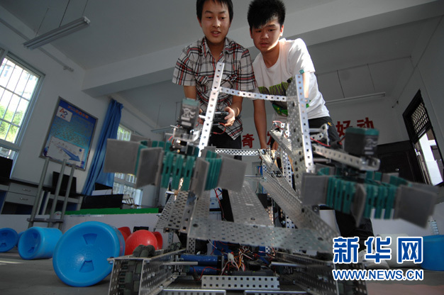 5月30日,蒲堃(左)和同学一起调试VX工程挑战赛机器人。在2012年RoboCup青少年世界杯中国赛区选拔赛上,陕西省宁陕中学高一学生陈秋江、张栎炜组成的代表队夺得“机器人救援B”项目冠军,6月将代表中国队前往墨西哥参加青少年机器人世界杯比赛。秦岭深处的陕西省宁陕县是国家级贫困山区县,这里的中学生们却不因大山的阻隔而放弃对知识的渴求。2011年,宁陕中学成立了以科技辅导员廖泽松老师为核心的“廖泽松工作室”,在廖泽松的指导下,30余名高一、高二学生参与到机器人兴趣小组中来,在工作室里学生们开始自己动手组装机器人并学习用C语言为机器人编写程序。2011年首次出征参加第十届中国青少年机器人竞赛陕西赛区选拔赛就获得冠军。高二(3)班的蒲堃是宁陕中学参加VX工程挑战赛的主要成员,家住宁陕县河心堡村的蒲堃从小没有什么玩具,动手能力颇强的他用家里一些废品制作了不少玩具。而像蒲堃这样的农村孩子在机器人兴趣小组里占到八九成,这些山里娃的眼睛里充满了对机械、电路和程序的强烈好奇。而就像“廖泽松工作室”里悬挂的标语——“探索始于好奇发明始于好动”一样,这些对机器人充满好奇感的山里孩子们正用他们缜密的思考和灵巧的双手开始探索科学之路。 新华社记者 李一博 摄