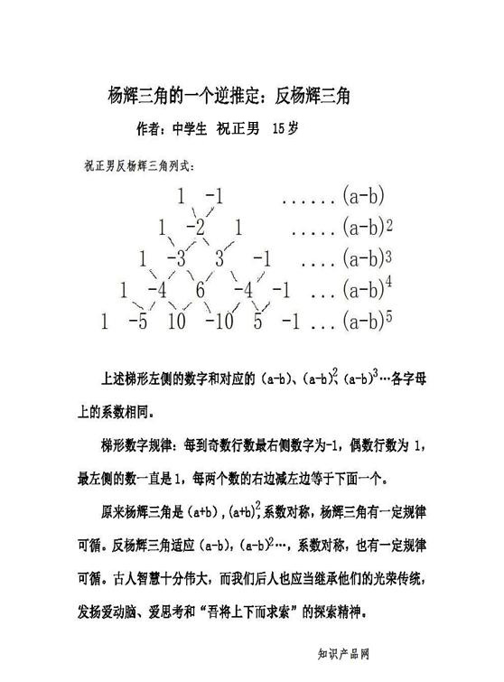 编者注:据我们了解,《反杨辉三角》作者祝正男是一名中学生,出生于海拉尔,学习上踏实钻研,参加过奥数比赛。平常学习中善于读书,尤其喜好数学,喜欢阅读课外科技书籍,常常爱提问题,勤于思索,自学过华罗庚数学著作。业余喜好球类运动,是一个品学优秀的学生。本网发表作者文章,是为了进一步促进大中学生开展创新活动,提倡创新思维、促进人才成长。